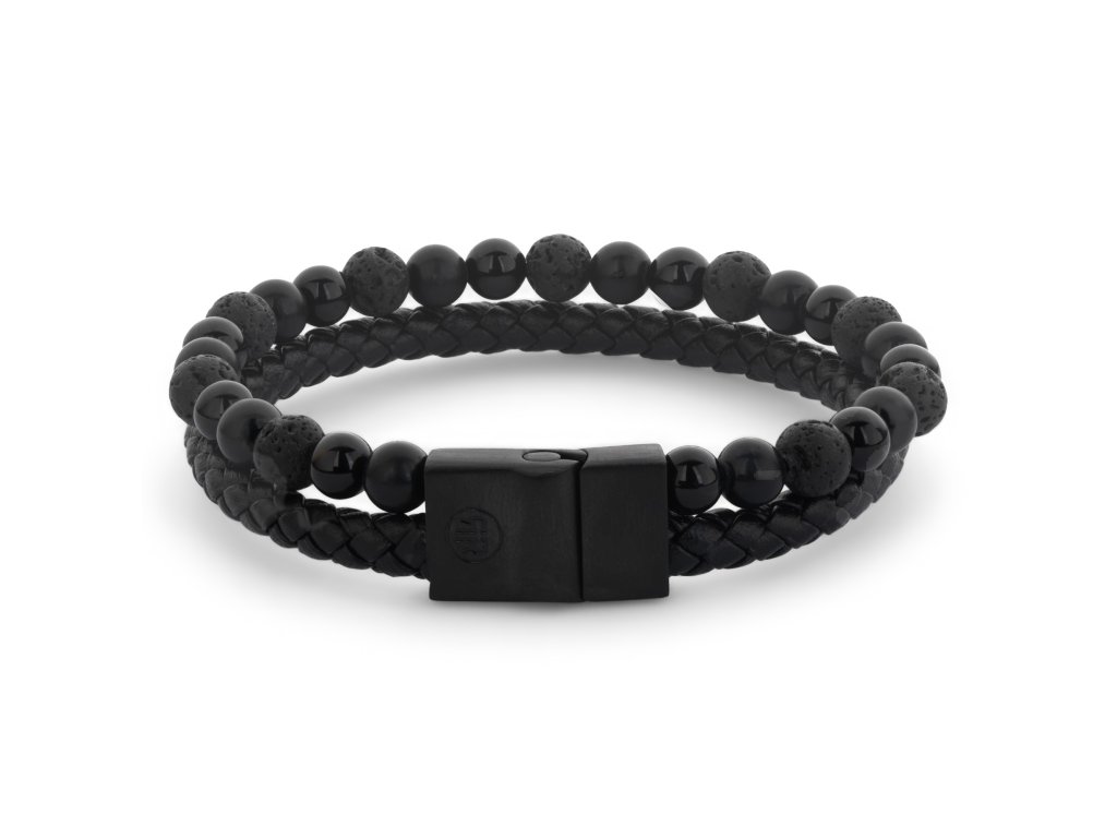 Vyrobené zkvalitná čierna koža a korálky. Tento 12 mm široký náramok je vybavený bezpečnostnou oceľovou sponou, ktorá zaistí, že náramok zostane bezpečne na vašom zápästí. Dvojitý dizajn dodáva náramku jedinečný a dynamický nádych, vďaka čomu ho musí mať každý, kto hľadá niečo originálne. Čierna farba dodáva náramku nadčasový a mužný vzhľad, ktorý sa hodí k rôznym štýlom.