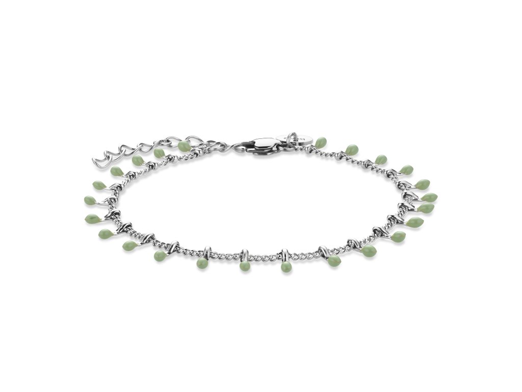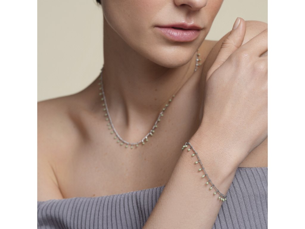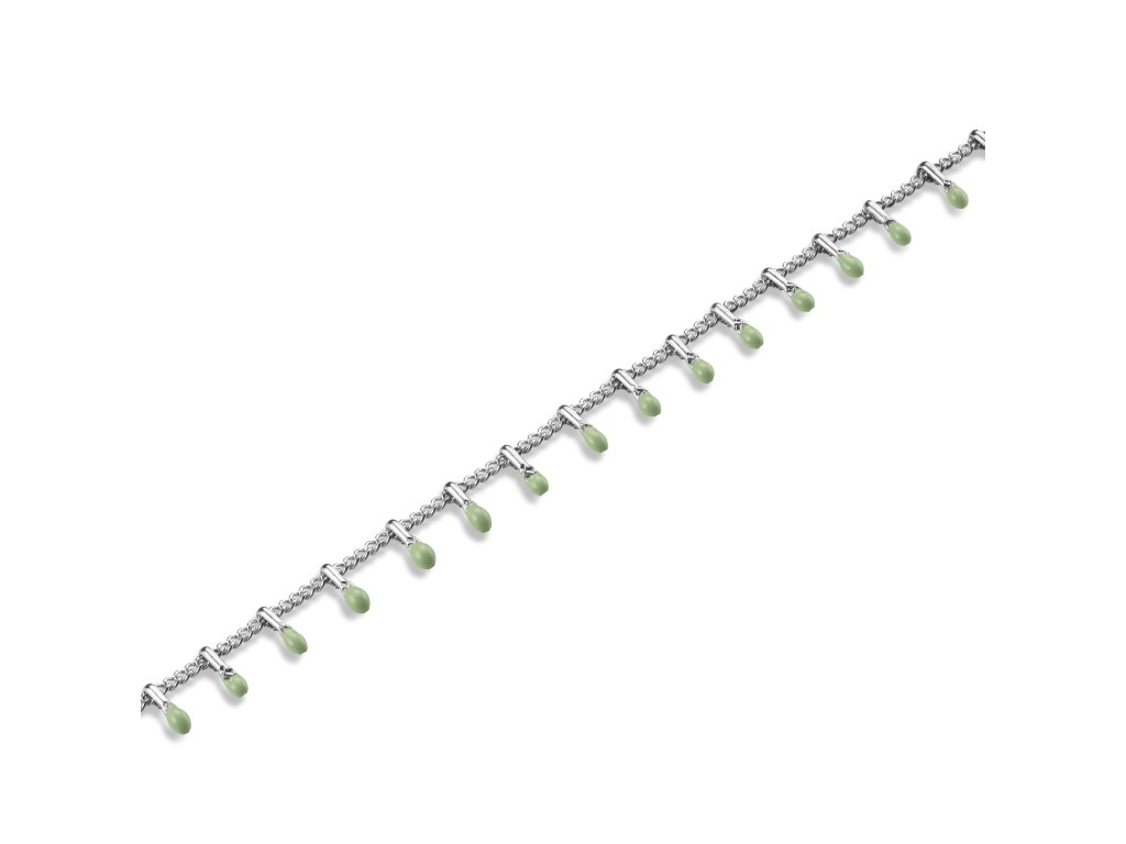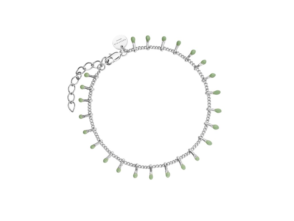 Náramok Rosefield, nehrdzavejúca oceľ, ródiovaný, malé kvapky z prírodného kameňa Jade, nastaviteľná dĺžka 16,5 - 19,5 cm.