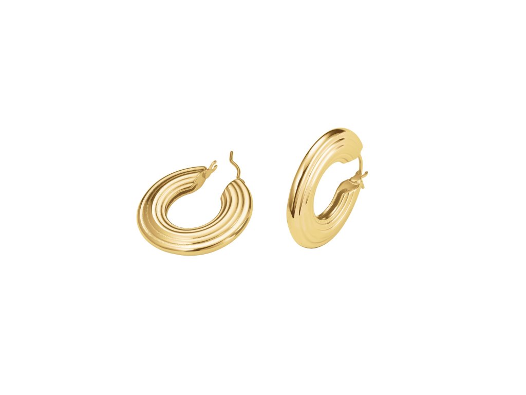 Ploché pruhované náušnice s obručami od spoločnosti Rosefieldpoteší milovníkov minimalizmu s jemným efektom. Ich klasický kruhový tvar dopĺňadetail plochých pruhovčo im dodáva moderný, mierne geometrický výraz.