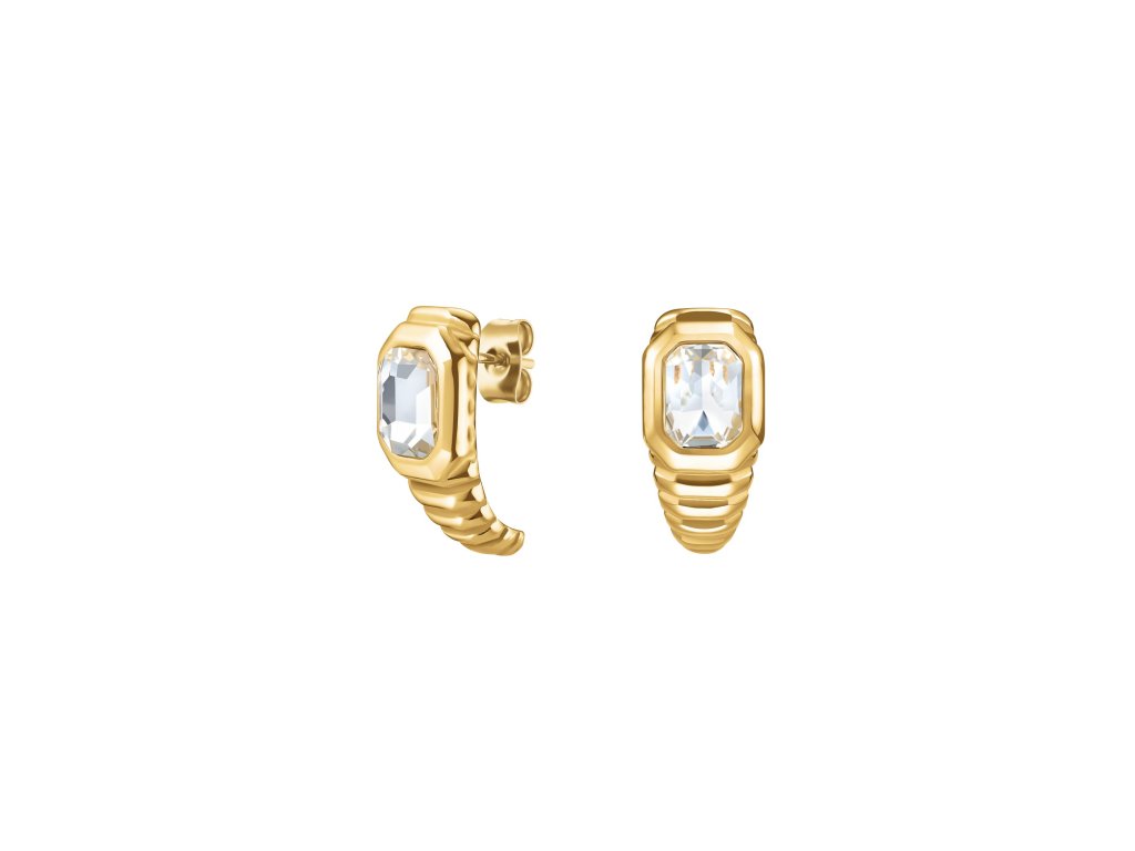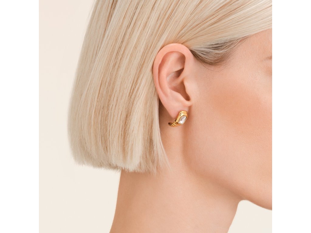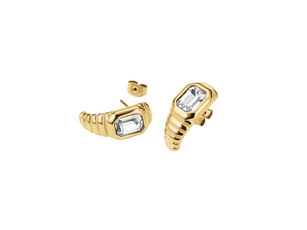 Náušnice Osemhranné hrebienkové náušnice od spoločnosti Rosefield combinejemný tvar kvapky s reliéfnym rebrovanímčo vytvára sofistikovanú textúru. Lesk materiálu a trblietanie kryštálov dodávajú náušniciam charakter šperku.