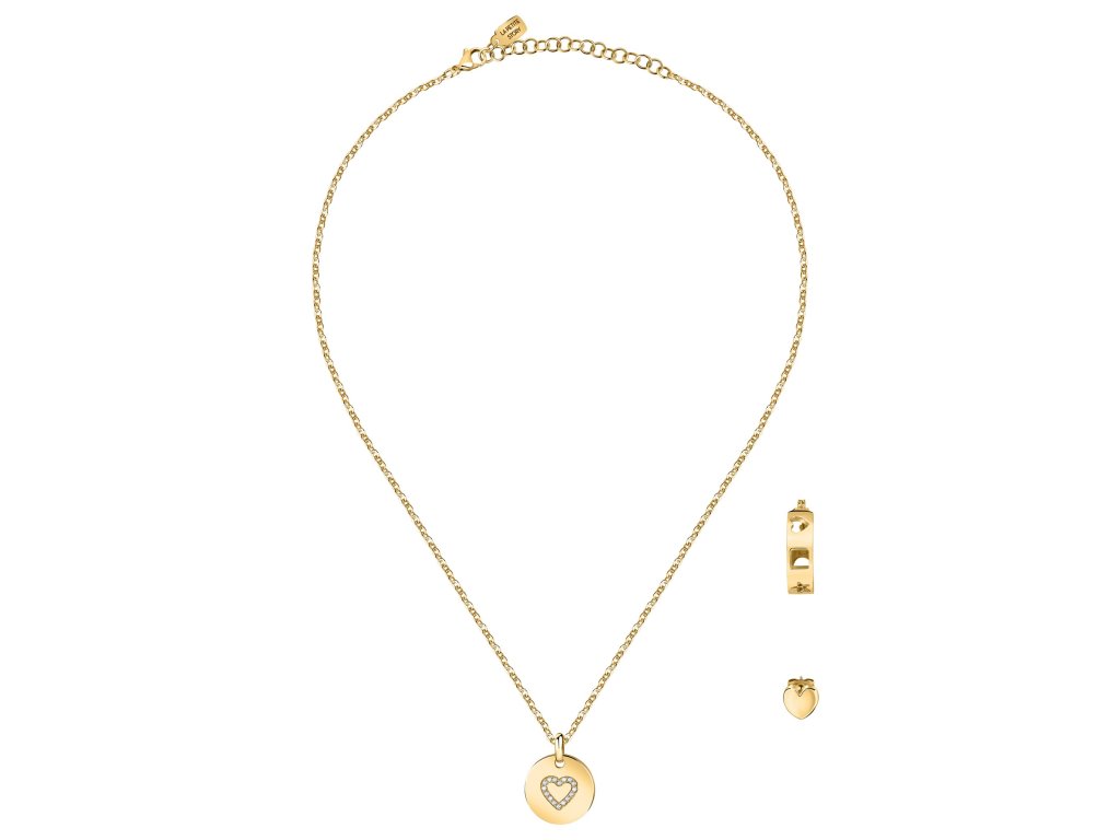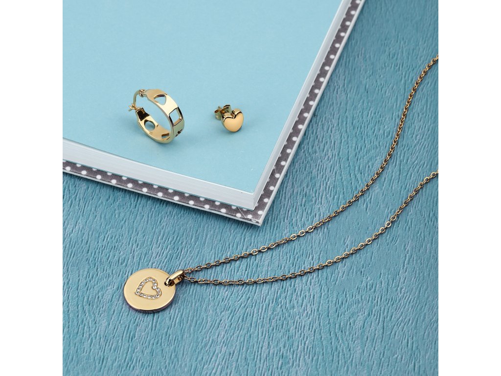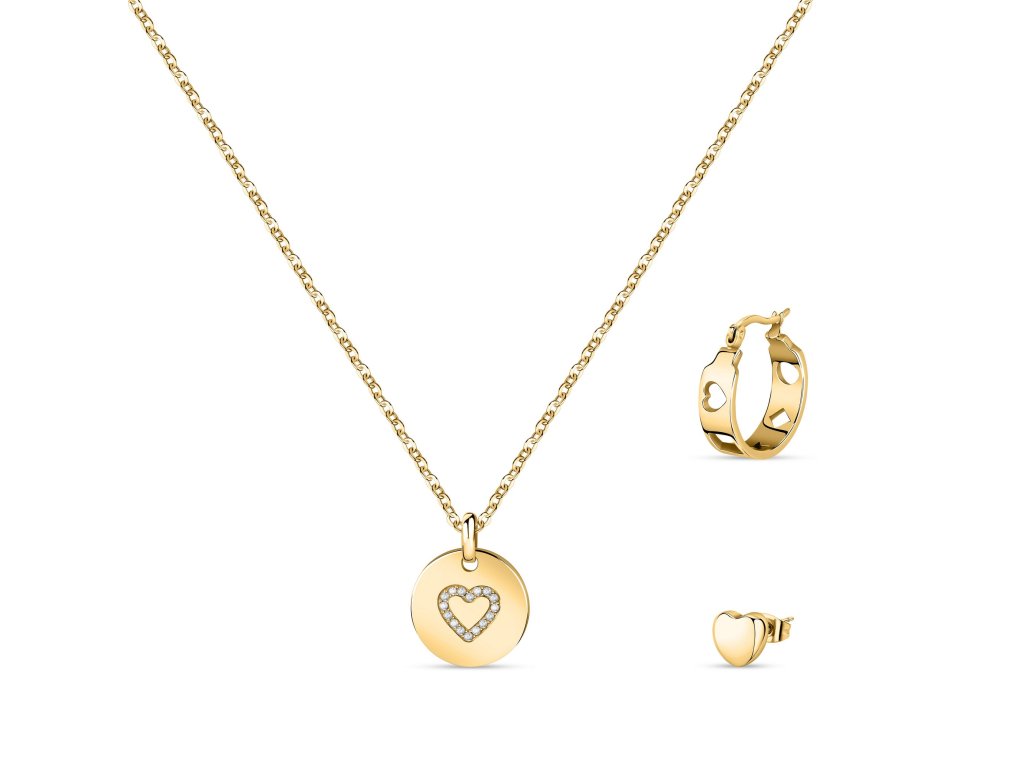 Obsahuje štýlový náhrdelník s príveskom srdca s čírymi kryštálmi a dve jednoduché náušnicejeden v tvare kameňa a druhý v tvare kruhu. Šperky sú vyrobené z pozlátenej ocele avďaka svojej symbolike je vhodný ako darček k narodeninám, výročiu alebo ako prejav lásky.