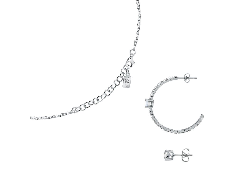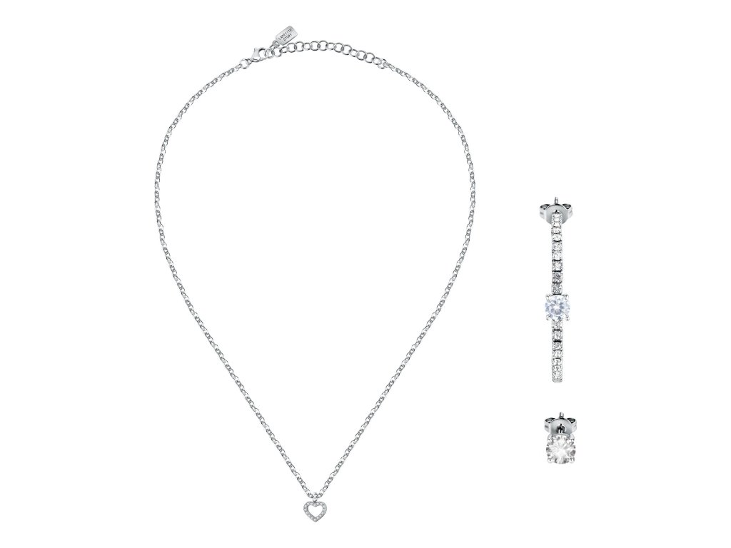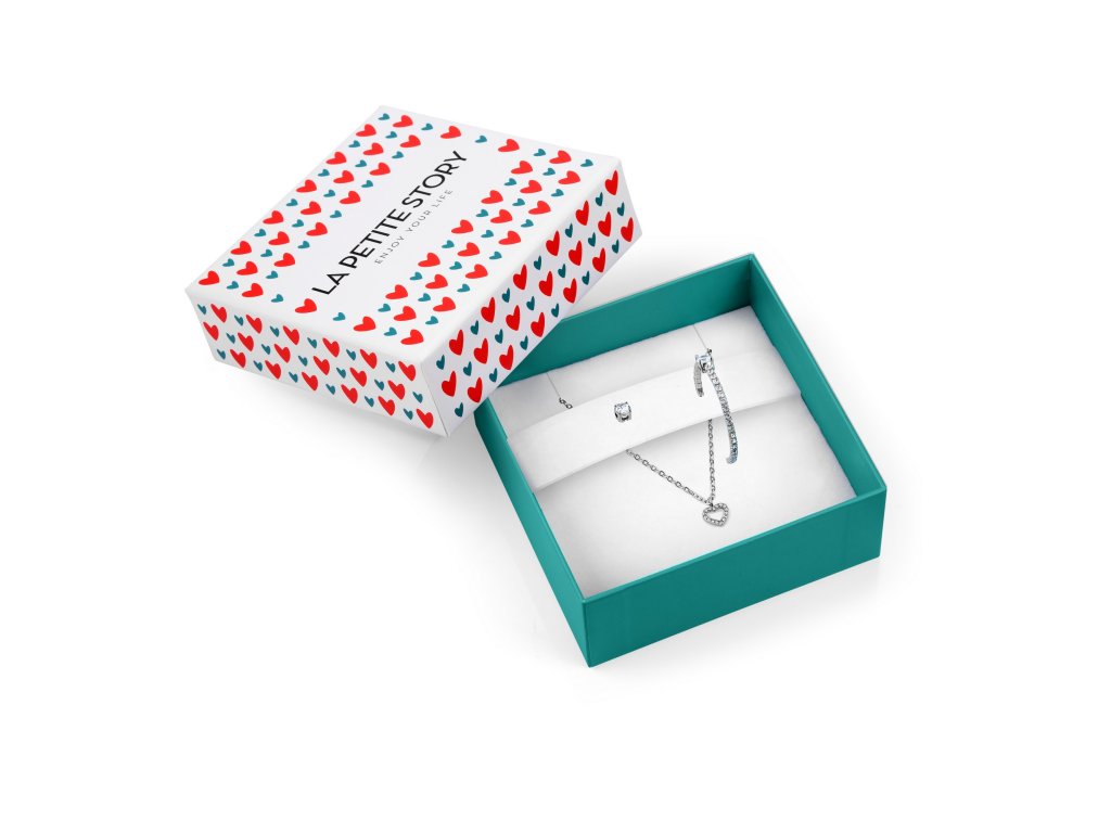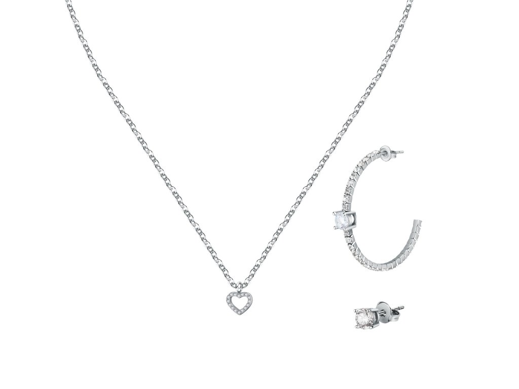 .Obsahuje štýlový náhrdelník s príveskom srdca s čírymi kryštálmi, dve jednoduché náušnice, jednu kamennú a druhú v tvare kruhu. Všetky šperky sú zdobené zirkónmi, vďaka ktorým doslova žiaria.