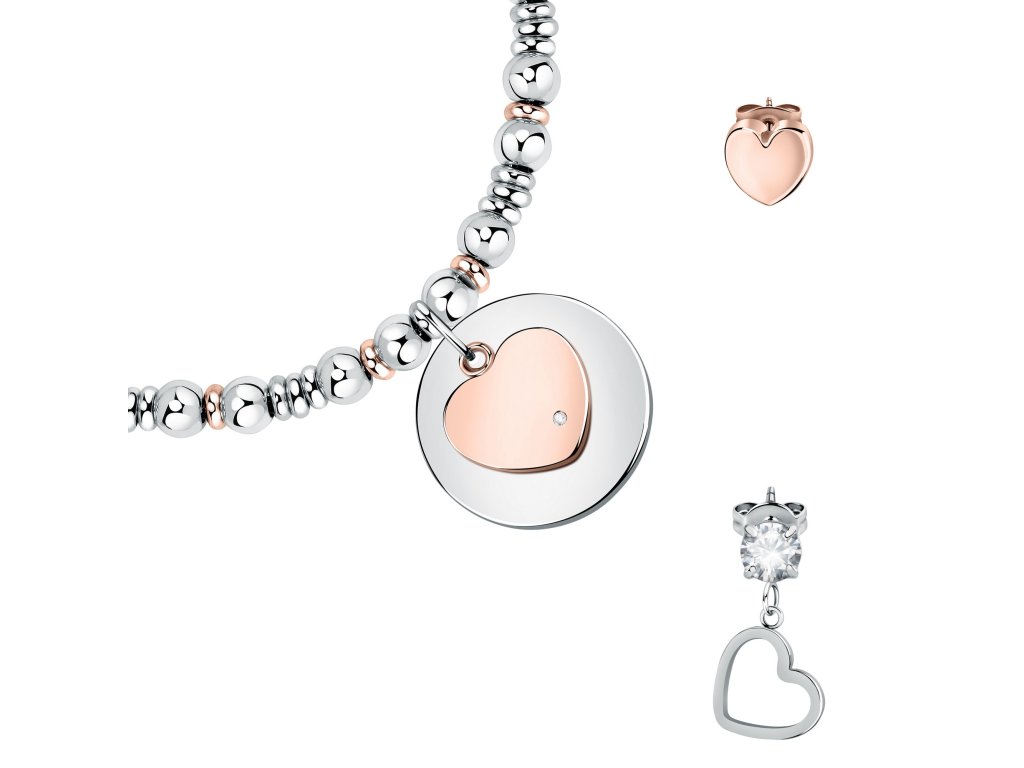 Guľôčkový náramok je zdobený okrúhlymprívesok so srdcom z ružového zlata a krištáľomčo dodáva šperku harmonický a moderný vzhľad.Súprava obsahuje dve jednoduché náušnice - puzetu v tvare srdca v ružovom zlate a visiacu náušnicu v striebornej farbe s obrysom srdca a zirkónovým kryštálom.