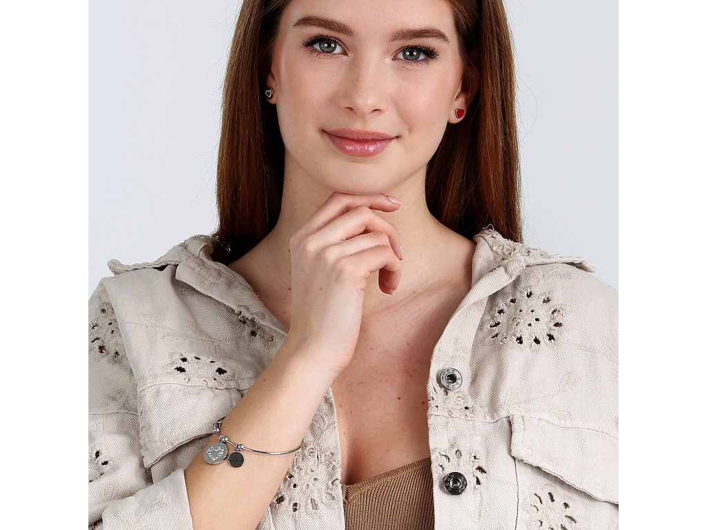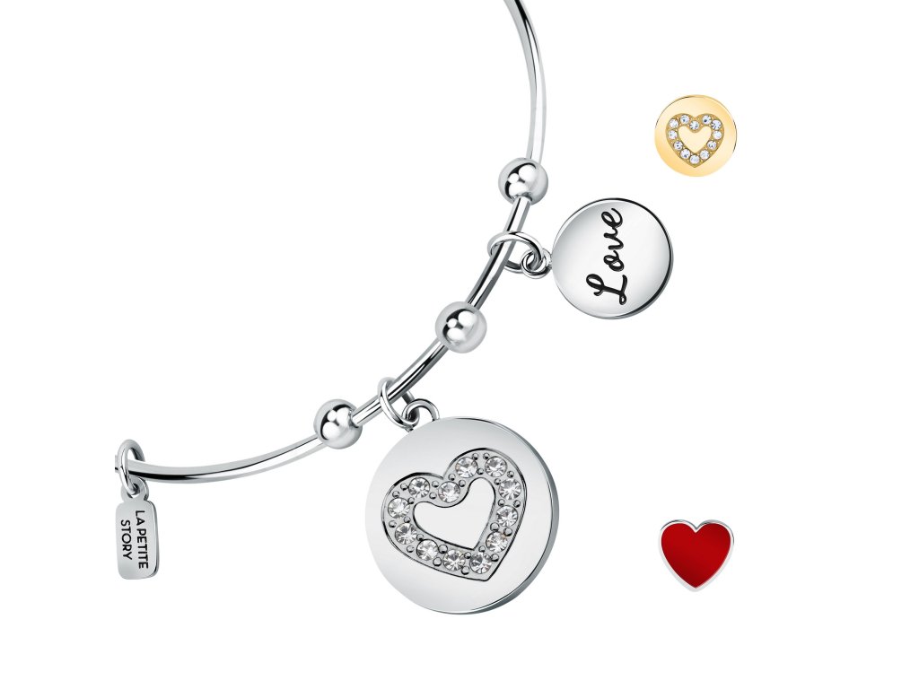 Darčeková súprava obsahujemasívny náramok s príveskom srdca v kruhu s čírymi kryštálmi, druhý prívesok je okrúhly s textom LOVE a dve jednoduché náušnice. Jeden so srdcom v kruhu s čírymi kryštálmi v žltej farbe, druhý v tvare srdca je zdobený červeným smaltom.