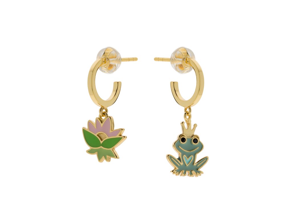 Tieto pozlátené strieborné detské náušnice s príveskom žabieho princa a lekna poteší všetkých malých milovníkov Disneyho rozprávkového sveta. Každá náušnica je iná, na jednej je vyobrazený roztomilý princ v podobe žabky, na druhej jemná lekno, čo dodáva šperku hravý a originálny vzhľad.