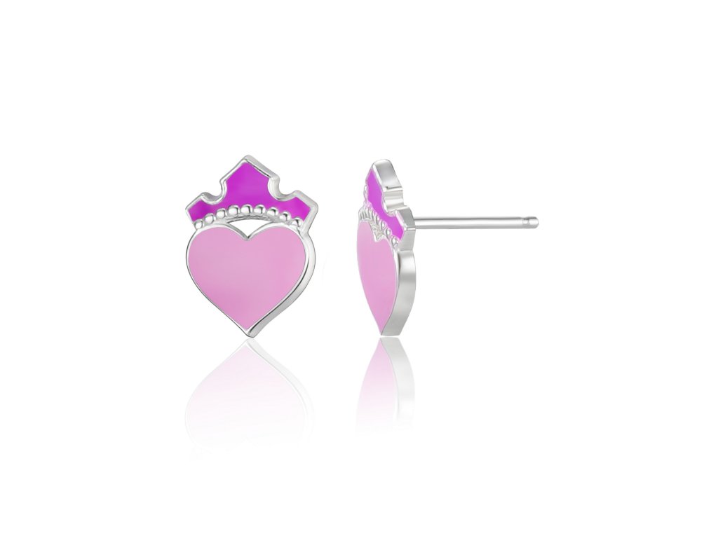 Tieto jemné náušnice sú vyrobené zo striebra 925 a zdobené starostlivo naneseným ružovým smaltom na srdiečko a fialovým smaltom na korunku. Kombinácia smaltu a striebrapôsobí hravým dojmom. Lesklý povrch zvýrazňuje detaily a dodáva náušniciam šmrnc. Jednoduché zapínanie na gombíky zaručuje pohodlné a spoľahlivé nosenie počas celého dňa.