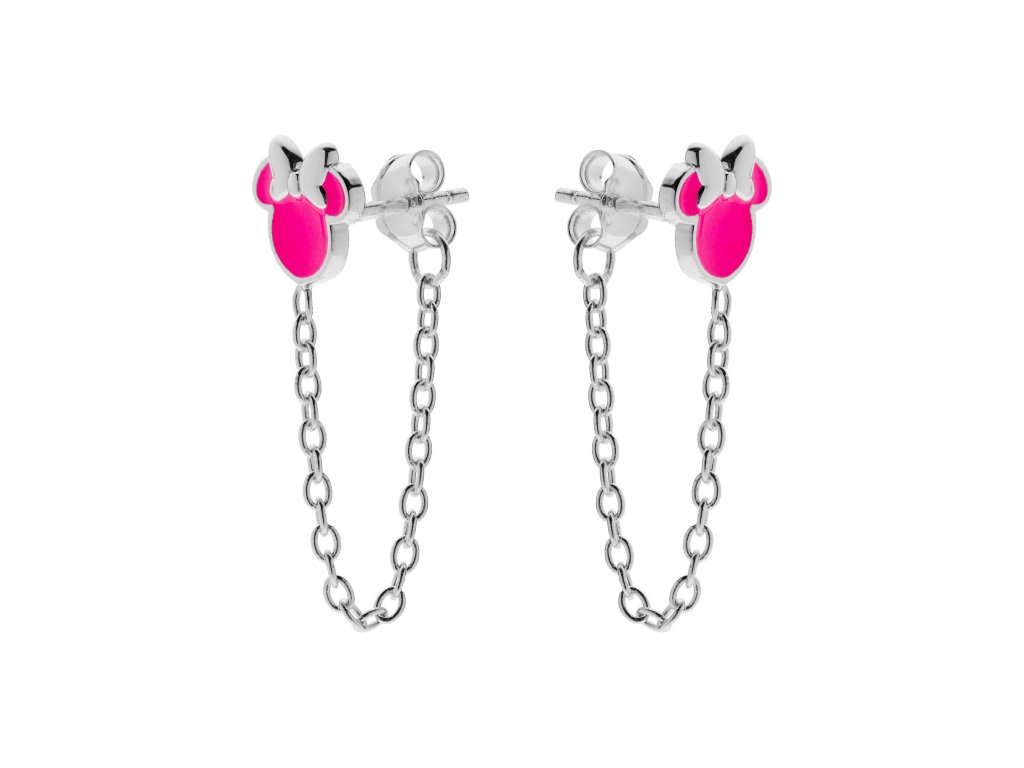 Náušnice v tvare postavičky Minnie Mouse od Disney sú vyrobené z kvalitného striebra s lesklou povrchovou úpravou. Sú zdobenéružový smaltktorý na šperku pekne vyniká. Zaujímavým detailom je retiazka, ktorá spája prednú časť náušníc so zapínaním v podobe prívesku, čo zaručuje pohodlné nosenie a zabraňuje strate náušníc. Dodávajú sa v štýlovej krabičke. Hmotnosť šperku je 2,3 g.