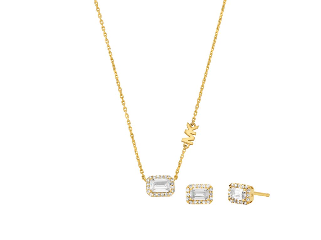 Dámska darčeková súprava šperkov Michael Kors prináša modernú eleganciu v podobe náhrdelníka a náušníc v tvare obdĺžnika. Sú vyrobené z pravého striebra 925/1000 a precízne pozlátené a pôsobia luxusným dojmom, ktorý je typický pre značku Michael Kors.
