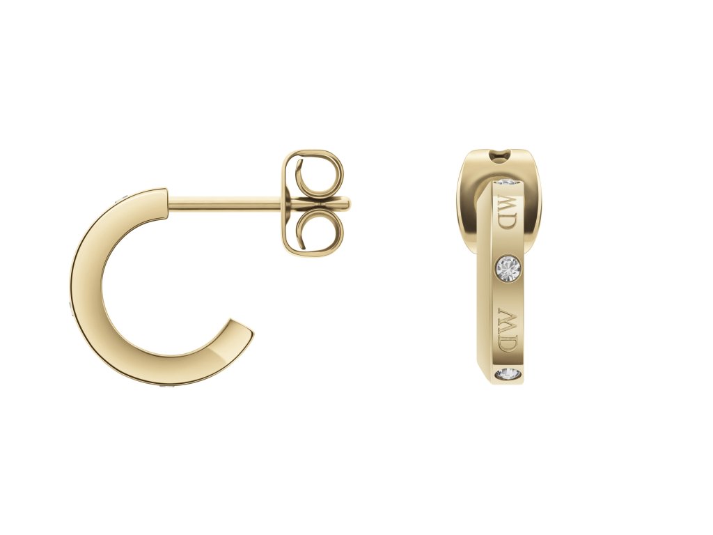 Polkruhové menšie náušnice s kryštálmi v zlatej farbe.