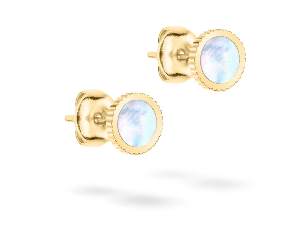 Náušnice boli vyrobenépoužitá nehrdzavejúca oceľ. Tento materiál je obľúbený na výrobu šperkov, pretože jeodolnosť voči korózii a má elegantný vzhľad. Náušnice sa pohodlne nosia vďaka bezpečnostnémuzapínanie na gombíky. Náušnice majú lesklý povrch, priemer 7 mm a zlatý povrch.