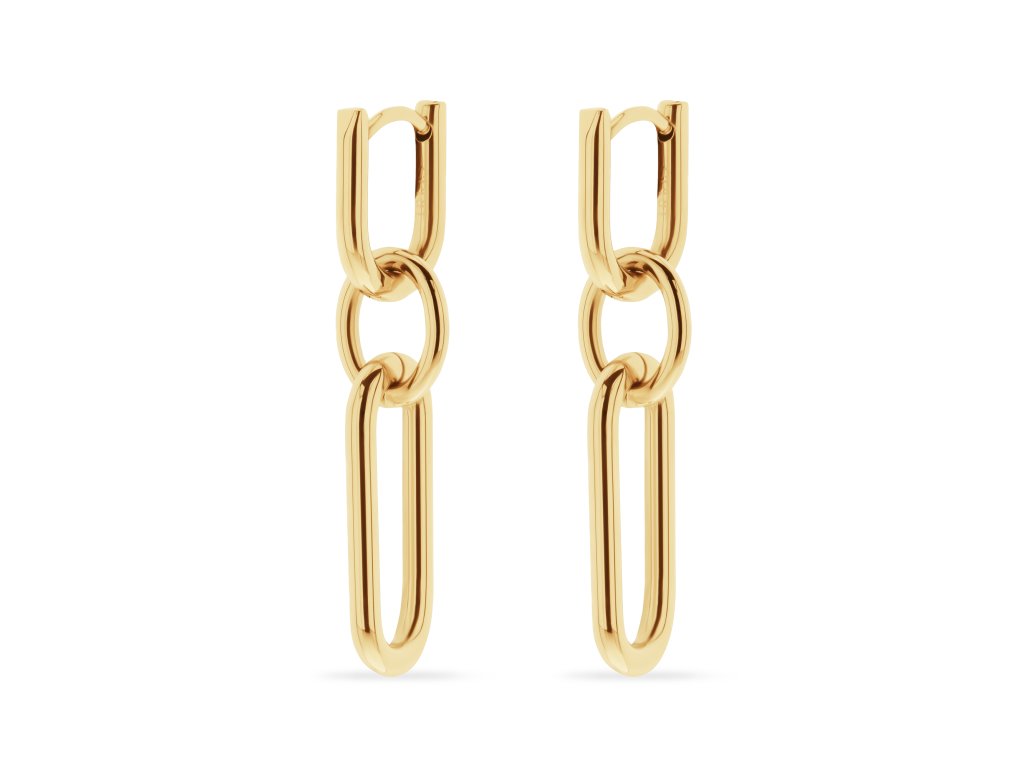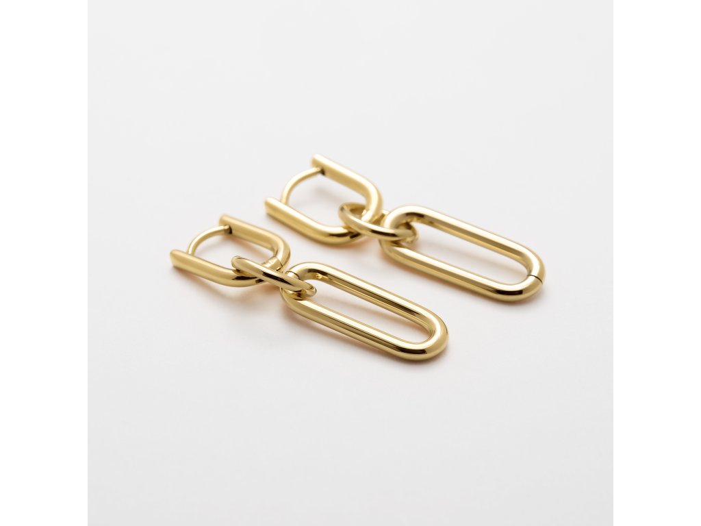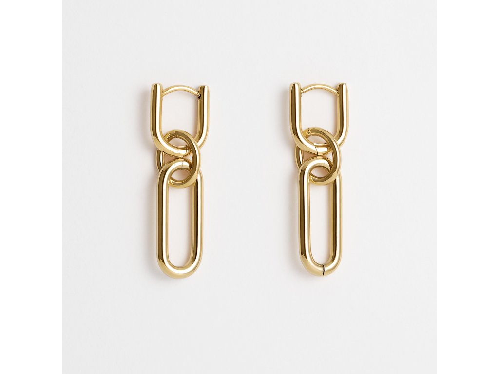 Pôsobivé je, že tieto zlaté náušnice sa skladajú z troch oddeliteľných častí, ktoréumožniť šperkom dodať iný vzhľad. Stačí odstrániť len dva spodné články. Základ tvorí spona s polodlhou obručou, na ktorej je zavesený malý krúžok pripomínajúci prsteň. Za týmto dielom potom nasleduje ďalší oválny článok. Tieto náušnice sú široké 8 mm, hrubé 1,9 mm a vážia 5,6 g. Aby ste zachovali krásu týchto náušníc, nevystavujte ich vode, vlhkosti, slnku, teplu, chemikáliám, kozmetike ani drsným čistiacim prostriedkom. V prípade potreby ich vyčistite mäkkou handričkou, ktorá nepúšťa vlákna; pri silnejšom znečistení použite horúcu vodu.