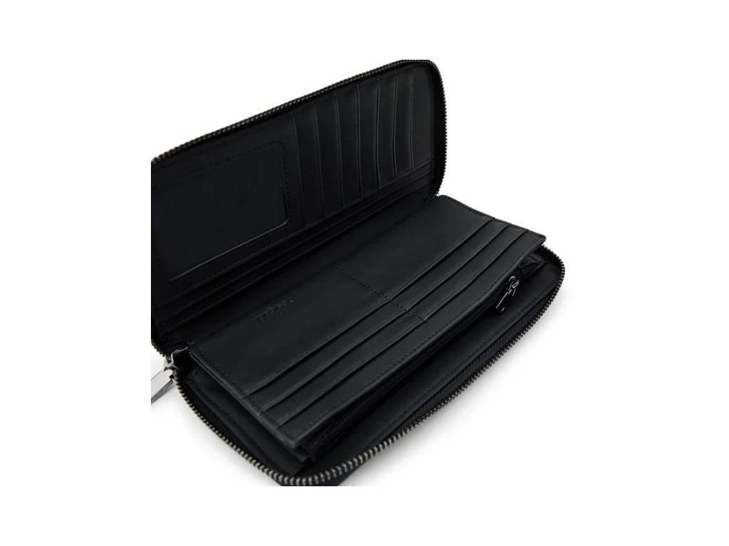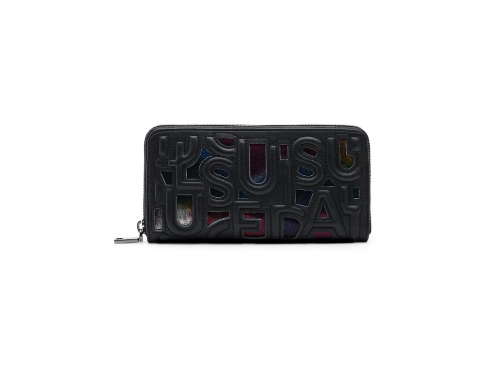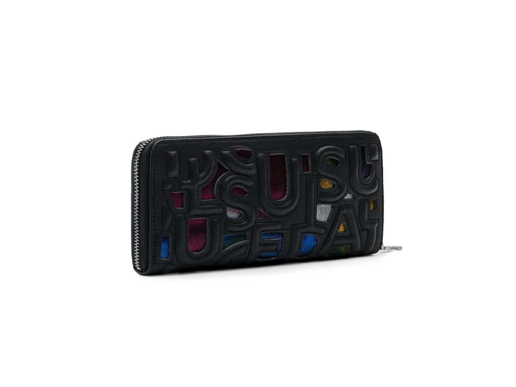 Unikátny patchwork dizajn z rôznych textúrovaných kožených efektov v hlbokej čiernej farbe (kód 2000) s reliéfnymi vyrezávanými písmenami dodá vašej peňaženke osobitý šmrnc – typický pre Desigual, kde každý detail kričí o slobode a originalite.