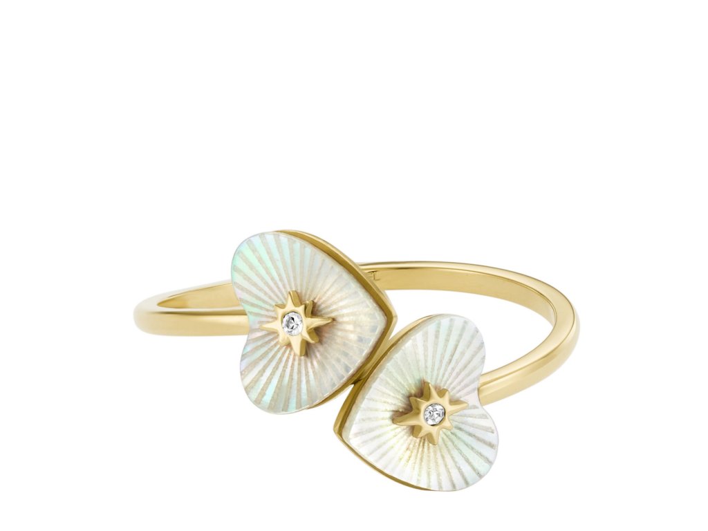 Tento prsteň od spoločnosti Fossil zaujme svojím netradičným dizajnom a jemným prevedením plným detailov.Kombinuje tvar srdca s perleťou, pozlátenými hviezdičkami a krištáľmi.