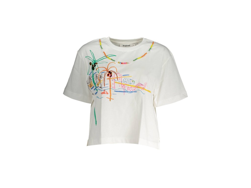 - Predná strana je ozdobená jedinečnou potlačou, ktorá zachytáva exotickú scenériu s palmami a farebnými prvkami. Táto umelecká potlač dodáva tričku hravý a svieži vzhľad.