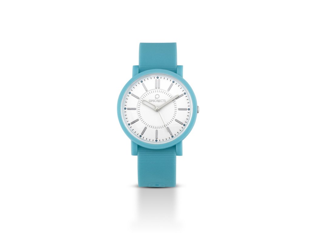 Okrúhle unisex hodinky v svetlozelenej farbe s bielym ciferníkom, sivozelenými značkami, sekundovou ručičkou a sivým logom.