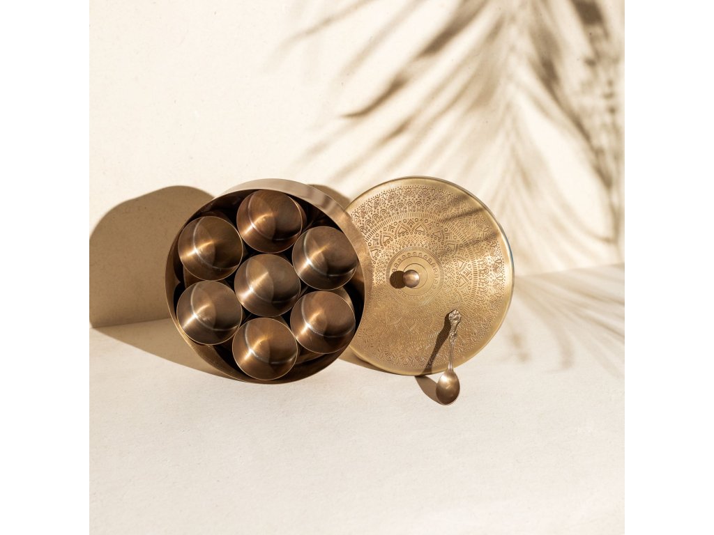 Typickú indickú kuchyňu si bez tradičných koreninových škatuliek nevieme predstaviť. Táto stránkaviacúčelový box je nimi inšpirovaný, ale môžete ho použiť aj mimo kuchyne. Uložte hobylinky, sladkosti na stolíku, ale aj šperky na komode. Súprava má vintage vzhľad a pozostáva zo 7 malých misiek, ktoré sú umiestnené v miske s priemerom 21 cm, a lyžice. Vďaka jemnému vzoru a rafinovanému vzhľadu bude elegantným doplnkom vmoderný a boho interiér.