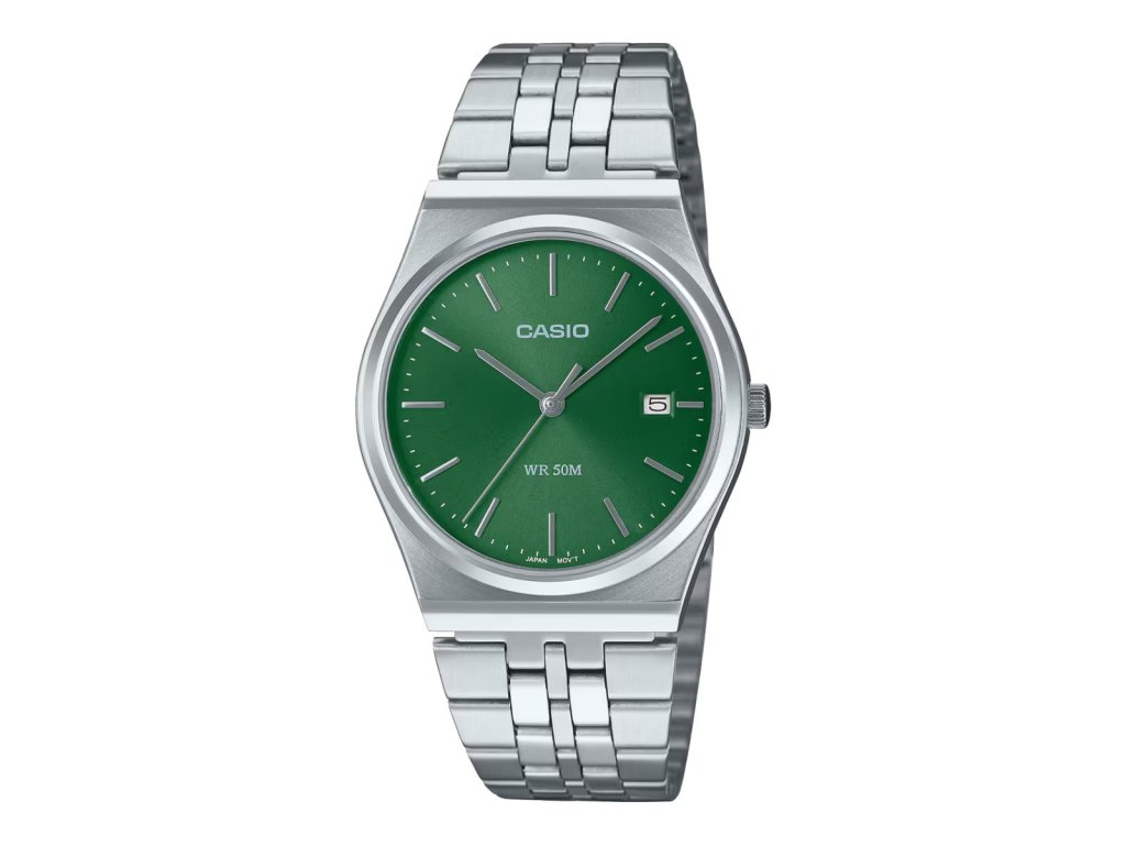 Okrúhle puzdro s priemerom 40 mm v decentnej šedej (silver / stainless steel) farbe, výrazný zelený ciferník s jednoduchými indexmi a ručičkami pre svieži a moderný vzhľad. Decentný monogram CASIO na ciferníku. Tlaková spona pre pohodlné a bezpečné zapínanie.