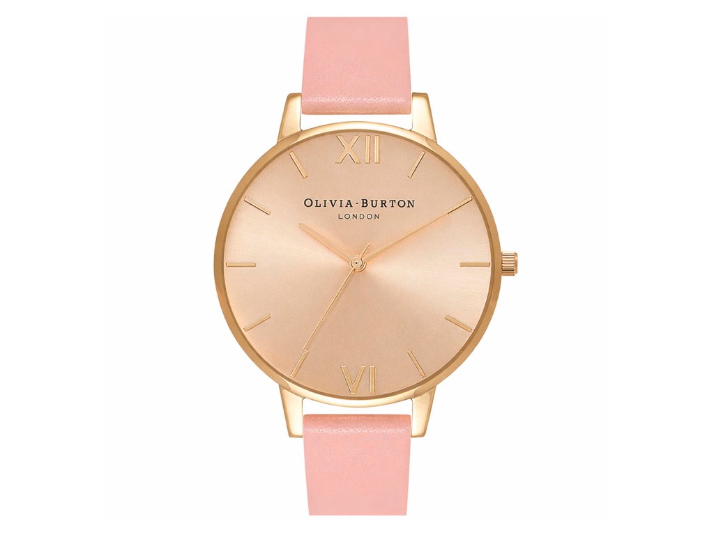 Okrúhle puzdro s priemerom 38 mm v atraktívnej ružovo-zlatej farbe (rose gold-tone stainless steel), ružový ciferník s jemnými indexmi, perleťovým efektom alebo decentným vzorom pre ženský a luxusný vzhľad. Ružový kožený remienok dodáva mäkký, harmonický a prírodný kontrast. Decentný monogram OLIVIA BURTON na ciferníku. Pracka (buckle) pre pohodlné zapínanie.