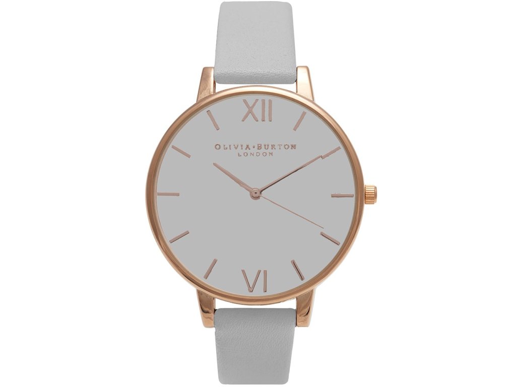 Okrúhle puzdro s priemerom 38 mm v atraktívnej ružovo-zlatej farbe (rose gold-tone stainless steel), šedý ciferník s jemnými indexmi, perleťovým efektom alebo decentným vzorom pre sofistikovaný a ženský vzhľad. Šedý kožený remienok dodáva prírodný, teplý a neutrálny kontrast. Decentný monogram OLIVIA BURTON na ciferníku. Pracka (buckle) pre pohodlné zapínanie.