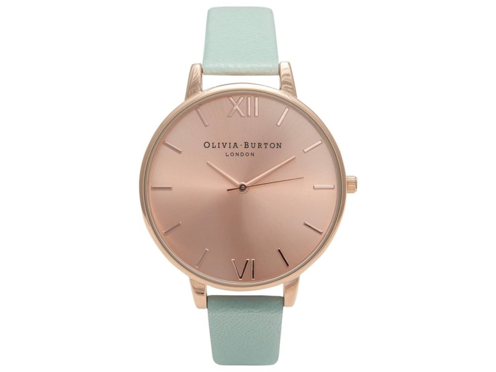 Okrúhle puzdro s priemerom 38 mm v atraktívnej ružovo-zlatej farbe (rose gold-tone stainless steel), ružový ciferník s jemnými indexmi, perleťovým efektom alebo decentným vzorom pre ženský a luxusný vzhľad. Ružový kožený remienok dodáva mäkký, harmonický a prírodný kontrast. Decentný monogram OLIVIA BURTON na ciferníku. Pracka (buckle) pre pohodlné zapínanie.