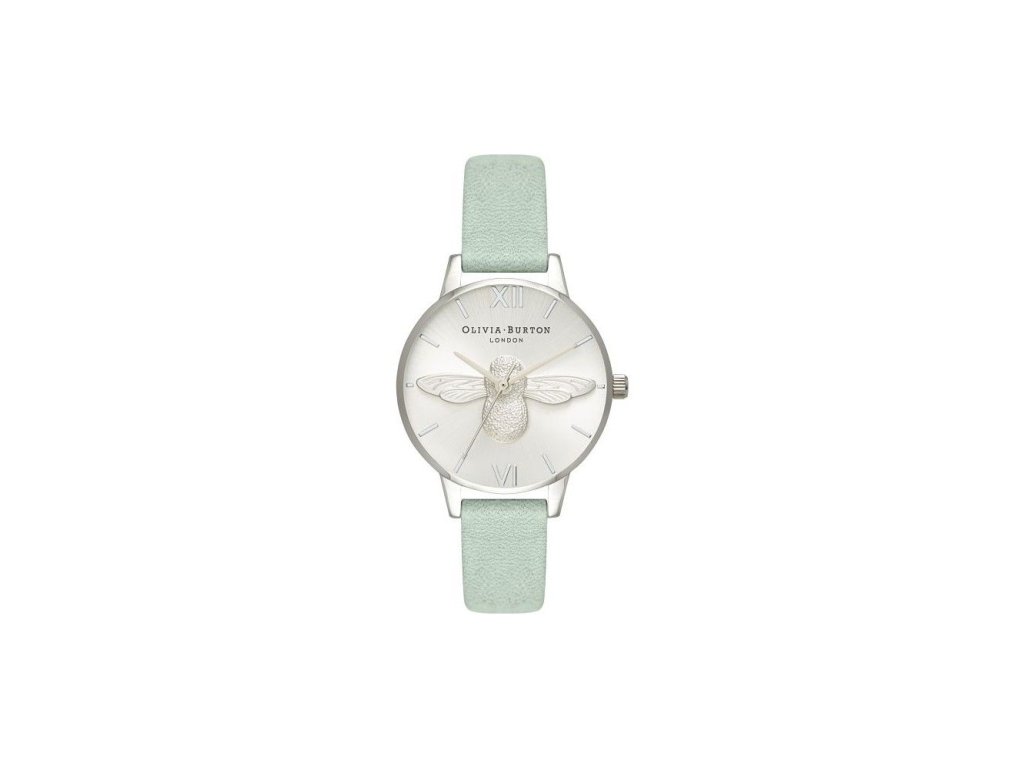 Veľmi kompaktné okrúhle puzdro s priemerom 30 mm v decentnej šedej farbe (silver-tone stainless steel), šedý ciferník s jemnými indexmi, perleťovým efektom alebo decentným vzorom pre maximálnu eleganciu a čitateľnosť. Zelený kožený remienok dodáva svieži, prírodný kontrast. Decentný monogram OLIVIA BURTON na ciferníku. Pracka (buckle) pre pohodlné zapínanie.