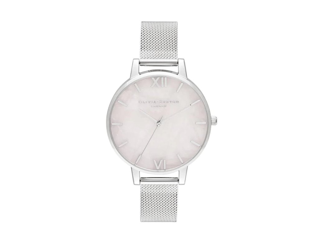Okrúhle puzdro s priemerom 38 mm v čistom striebornom prevedení (silver-tone stainless steel), ružový ciferník s jemnými indexmi, perleťovým efektom alebo decentným vzorom pre ženský a luxusný vzhľad. Strieborný oceľový náramok dodáva elegantný a neutrálny kontrast. Decentný monogram OLIVIA BURTON na ciferníku. Posuvná spona pre pohodlné a bezpečné zapínanie.