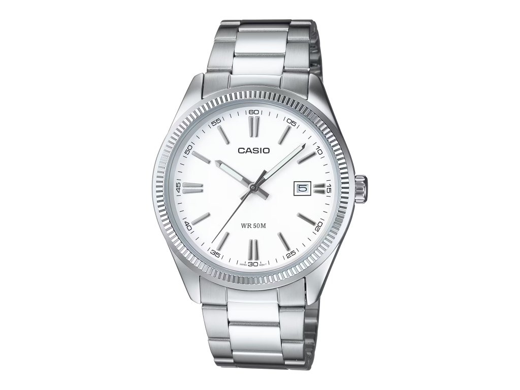 pánske hodinky • CASIO hodinky • elegantné hodinky • kovový náramok • 34,5 mm hodinky • quartz hodinky • hodinky so zľavou • značkové pánske hodinky • biely ciferník • šedé hodinky • vodeodolné hodinky