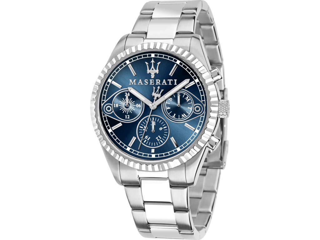 Okrúhle puzdro s priemerom 43 mm v čistom striebornom prevedení (silver-tone stainless steel), výrazný modrý ciferník so slnečným efektom alebo jemným vzorom pre nádherný lesk a hĺbku. Praktické indexy a ručičky, decentný monogram MASERATI na ciferníku. Drop-down / push-button spona pre pohodlné a bezpečné zapínanie.