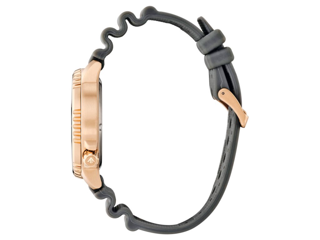 Robustné 44 mm puzdro z nehrdzavejúcej ocele v zlatej farbe (gold-tone) s jednosmerným otočným bezelom pre presné meranie času pod vodou. Tmavý čierny ciferník s výraznými luminiscenčnými ručičkami a indexmi – perfektná čitateľnosť aj v hlbokej tme alebo pod vodou. Čierny gumový remienok (polyurethane) s buckle zapínaním je pohodlný, rýchloschnúci a ideálny na mokré aktivity. Celkový dojem je odvážny, luxusný a profesionálny – skvelý na more, rieku aj ako výrazný denný kúsok.