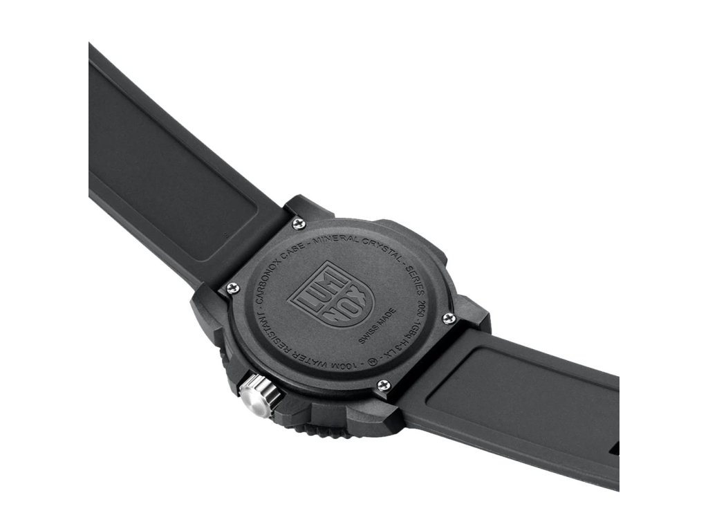 Veľké okrúhle puzdro s priemerom 44 mm z ľahkého a extrémne odolného karbónu v čiernej farbe, čierny ciferník s luminiscenčnými prvkami pre čitateľnosť v tme. Čierny resin remienok dodáva maximálnu odolnosť, pružnosť a pohodlie. Decentný monogram LUMINOX na ciferníku. Pracka (buckle) pre rýchle a bezpečné zapínanie.