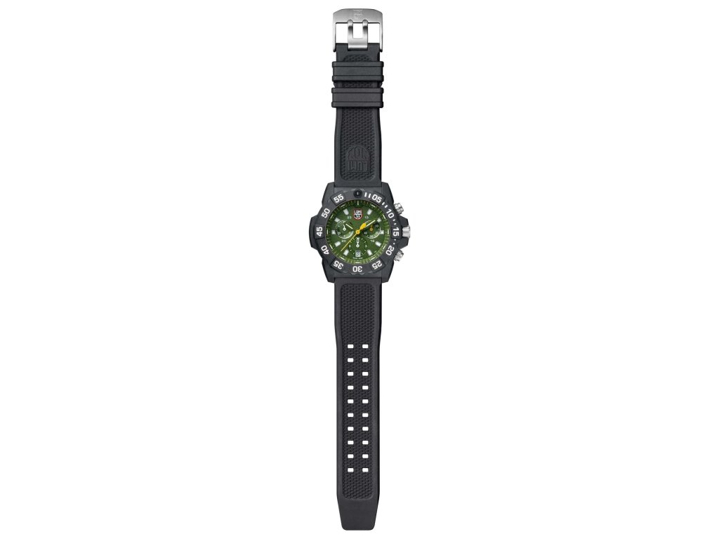 Veľké okrúhle puzdro s priemerom 45 mm z ľahkého a extrémne odolného karbónu v čiernej farbe, výrazný zelený ciferník s luminiscenčnými prvkami pre čitateľnosť v tme. Čierny gumový remienok dodáva maximálnu odolnosť, pružnosť a pohodlie. Decentný monogram LUMINOX na ciferníku. Pracka (buckle) pre rýchle a bezpečné zapínanie.