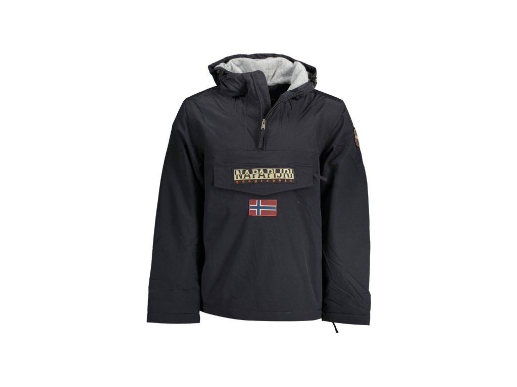 Klasický anorak (pull-over cez hlavu) s kapucňou (nastaviteľnou), polovičným zipsom, veľkým kangaroo vreckom na hrudi s potlačou NAPAPIJRI GEOGRAPHIC a ikonickou nórskou vlajkou. Regulérny strih, elastické manžety a spodný lem sťahovací šnúrkou – praktický a moderný urban dizajn v čiernej farbe.