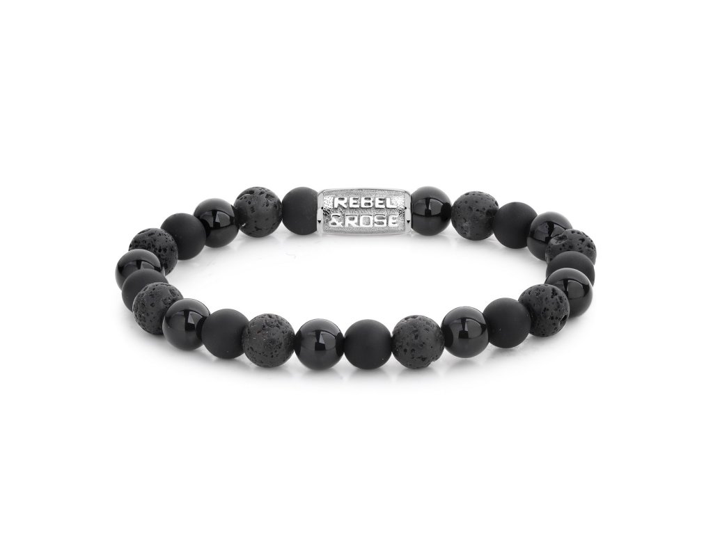 Náramok kombinuje tmavé kamene achátu, ónyxu a lávy s priemerom 8 mm a je doplnený ozdobným zapínaním v striebornej farbe.