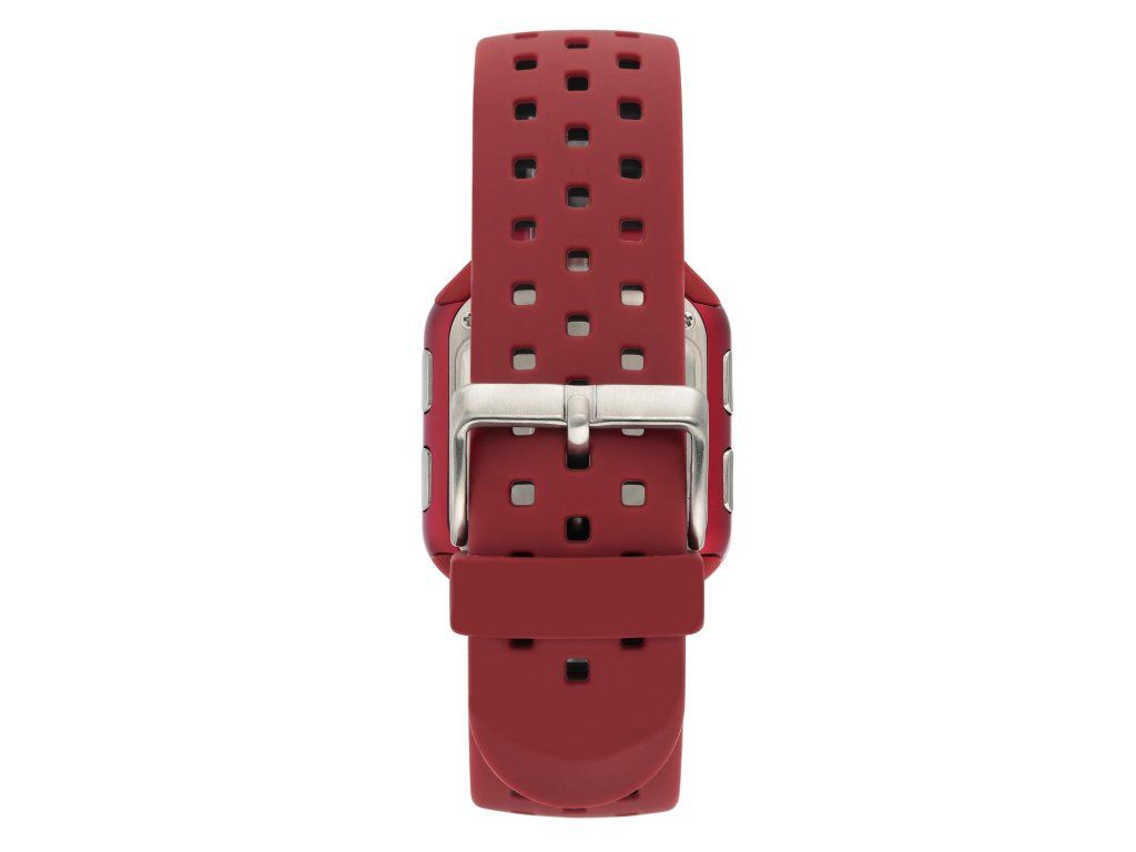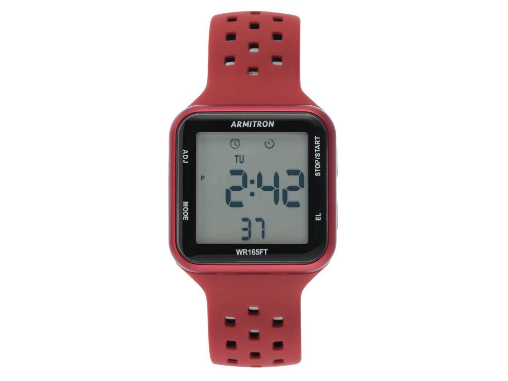 Unisex športové hodinky Armitron s decentným tvarom, tmavočerveným remienkom a jasným štvorcovým displejom s mnohými funkciami.