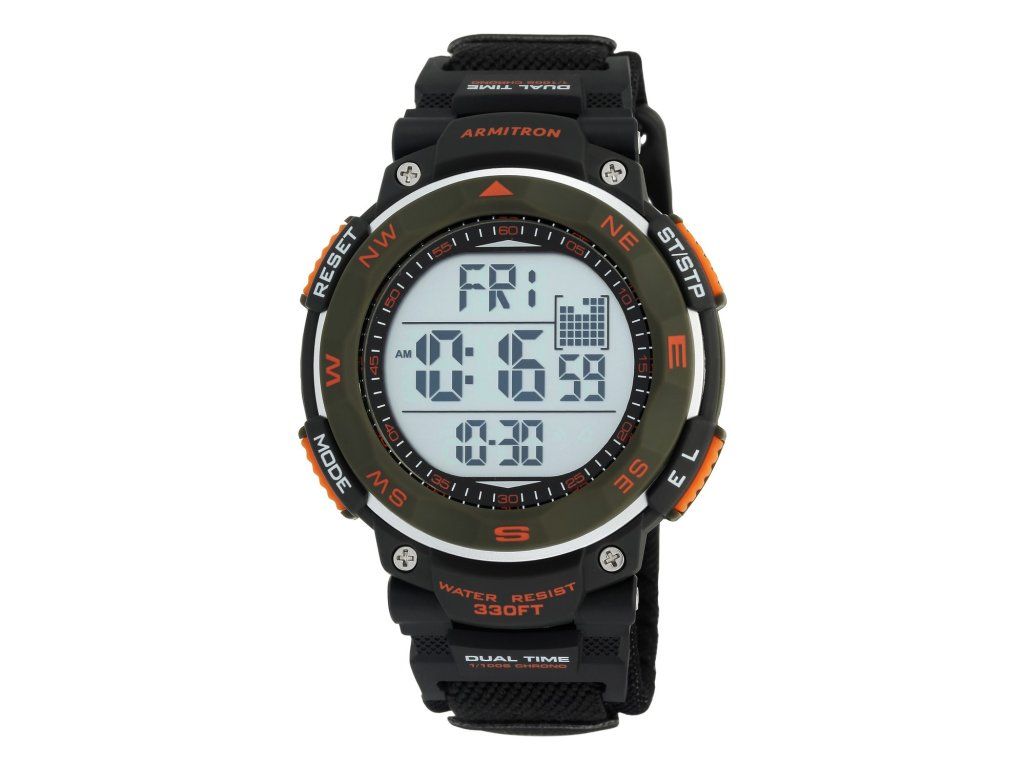 Športové pánske hodinky Armitron s multifunkčným displejom a červenými kontrastmi.