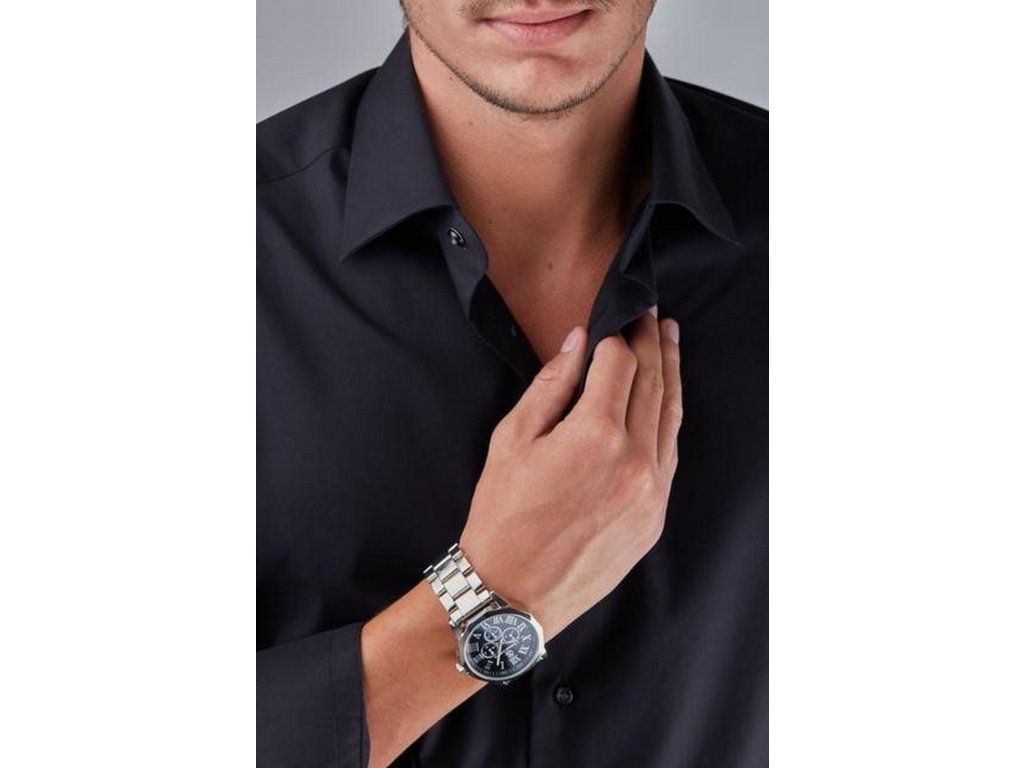 Čierny ciferník s kontrastnými striebornými indexmi v podobe rímskych číslic a ručičiek zaujme svojimi detailmi. Okrúhle puzdro v kombinácii so strieborným kovovým ťahom pôsobí nadčasovo a sviežo zároveň.