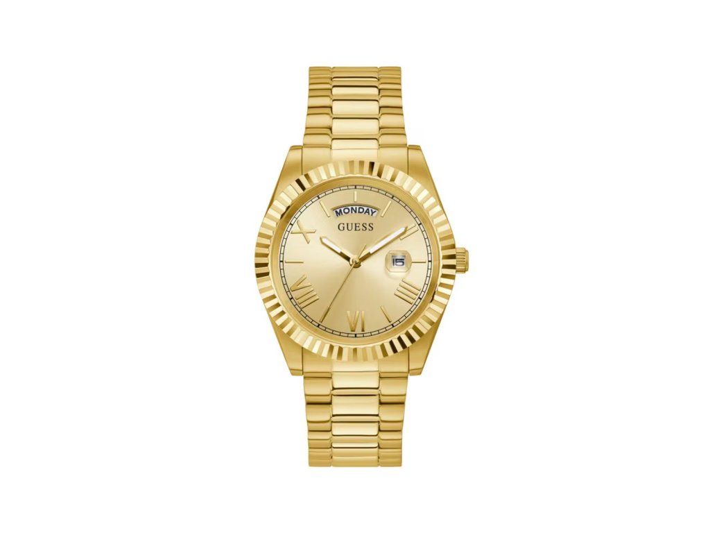 HODINKY GUESS MAN GW0265G2 (42MM). Typ mechanizmu: QUARTZ. Displej: HODINKY: ANALOGICKÉ. Materiál puzdra: MATERIÁL: NEHRDZAVEJÚCA OCEĽ. Farba puzdra: FARBA: ZLATÁ. Materiál náramku: MATERIÁL NÁRAMKU: NEHRDZAVEJÚCA OCEĽ. Farba náramku: ZLATÁ. Farba ciferníka: ZLATÁ. Typ skla: MINERÁLNE. Sklo: BUTTERFLY. Priemer ciferníka: dĹŽKA CIFERNÍKA: 42MM. Ponoriteľnosť: 5ATM