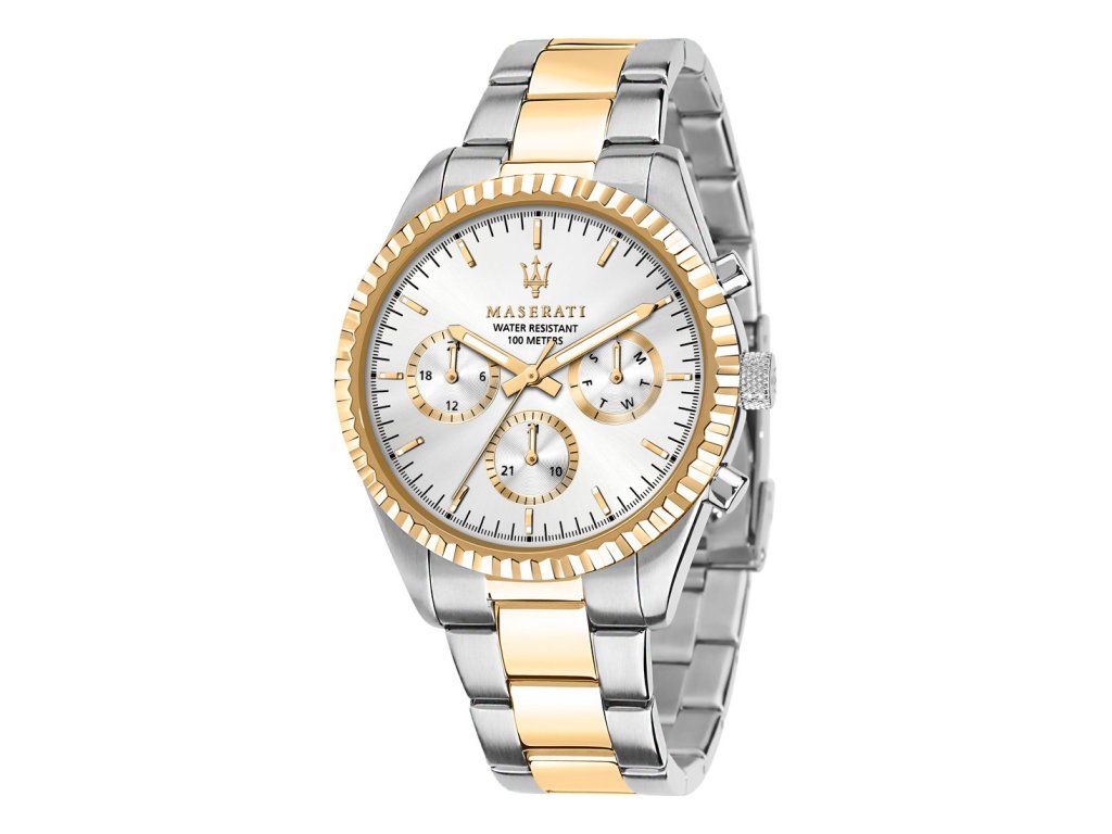 HODINKY MASERATI MAN R8853100021 (43MM). Typ mechanizmu: QUARTZ. Displej: HODINKY: ANALOGICKÉ. Materiál puzdra: MATERIÁL: NEHRDZAVEJÚCA OCEĽ. Farba puzdra: STRIEBORNÁ: FARBA PUZDRA: STRIEBORNÁ. Materiál náramku: MATERIÁL NÁRAMKU: NEHRDZAVEJÚCA OCEĽ. Farba náramku: FARBA NÁRAMKU: ZLATÁ. Farba ciferníka: BIELA. Typ skla: SKLÍČKO: MINERÁLNE. Clousure: DROP DOWN. Priemer ciferníka: dĹŽKA CIFERNÍKA: 43MM. Ponorný: 10ATM