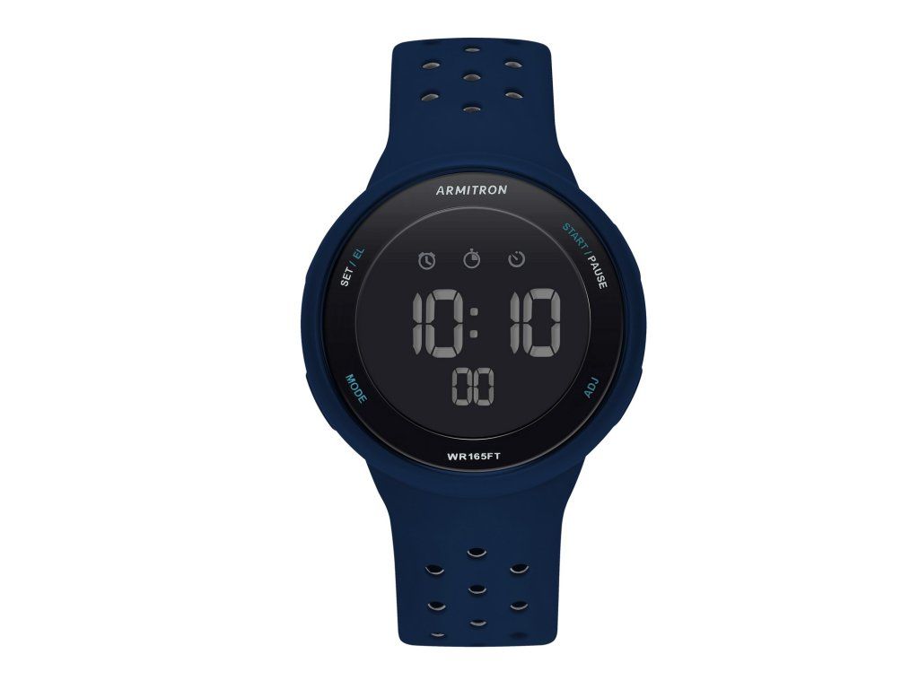 Unisex športové hodinky Armitron majú minimalistický štýl. Okrúhly tmavý displej má niekoľko funkcií a ladí s tmavomodrým remienkom.