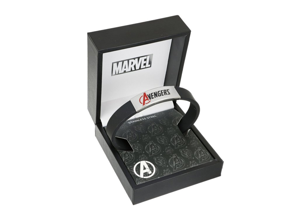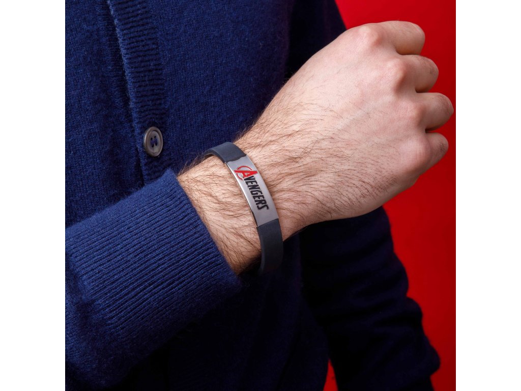 Náramok je vyrobený zčierny silikónový remienokna ktorom svietinápis Avengers z nehrdzavejúcej ocele a zdobené červeným a čiernym smaltom.