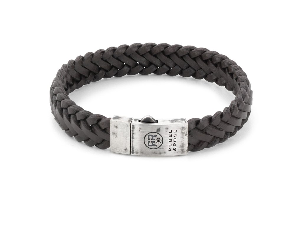 Hnedý kožený náramok je ozdobne prepletený a má strieborné zapínanie.