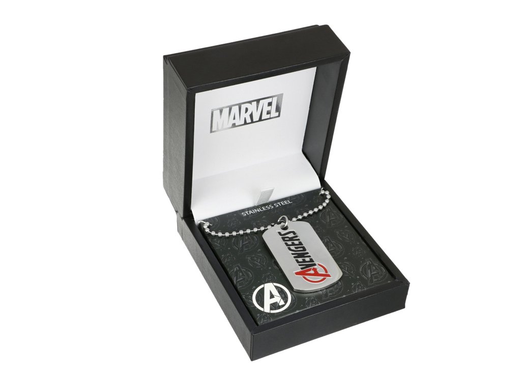 Náhrdelník zaujme na prvý pohľadoceľový prívesok v tvare vojenskej psej známky s nápisom AVENGERS. Povrch dosky je potiahnutý vysokokvalitnou PVD vrstvou na zachovanie lesku a odolnosti. Prívesok je naštýlová guľôčková reťaz je vyrobený z nehrdzavejúcej ocele, zakončený karabínou a má dĺžku 56 cm.