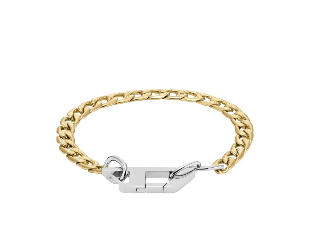 Pánsky pozlátený oceľový náramok s logom na zapínaní stelesňuje kombináciu moderného minimalizmu a typického dieselského rukopisu.Lesklý zlatý povrch dodáva náramku luxusný vzhľadbez prehnaného dôrazu - je jemný, ale nezameniteľný.