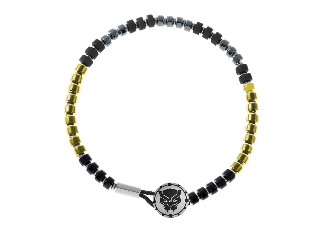 Náramok je vyrobený zo syntetických korálok v tmavých odtieňoch v kontraste so zlatými a oceľovými korálkami. Tentovýrazná farebná kombinácia sama o sebe vzbudzuje rešpekt. Oceľaplikácia s legendárnou témou Black Panther s PVD vrstvou je celkový dojem sily a odvahy ešte silnejší.