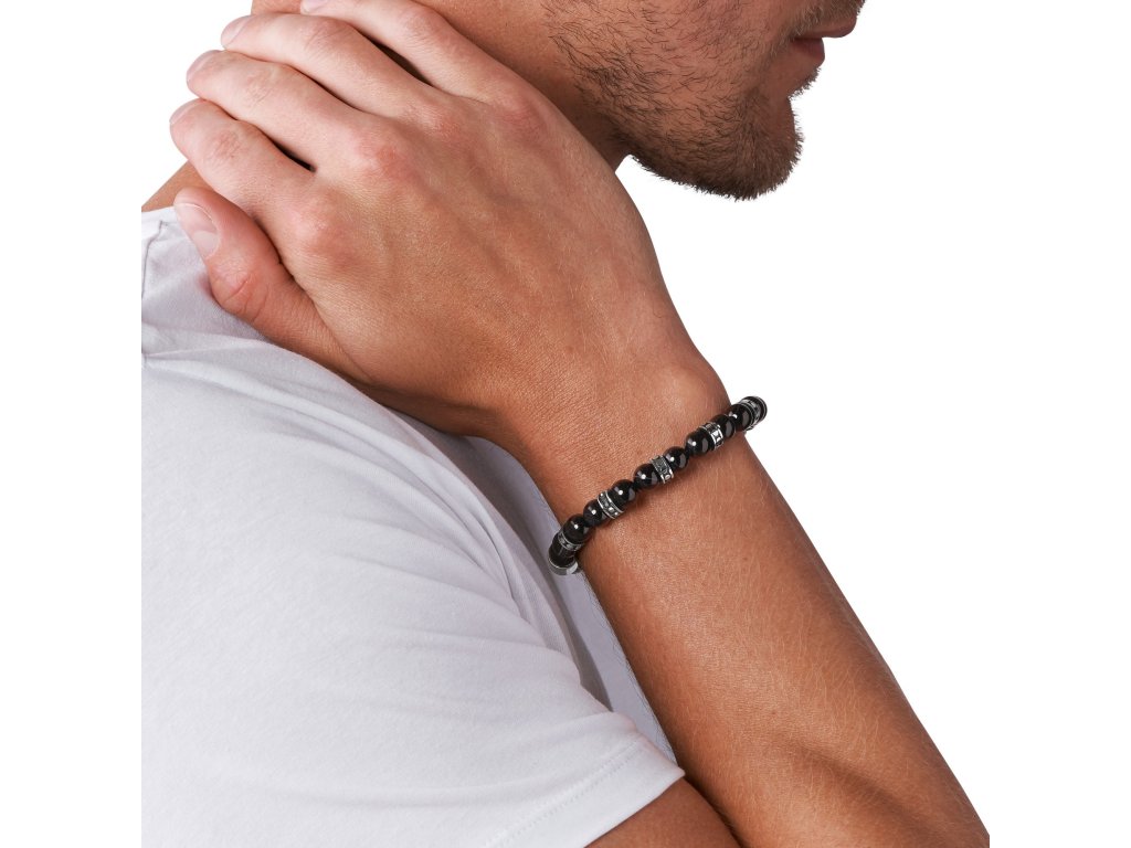 V náramkuspĺňajú dva typy korálok, oceľové s detailmi a prírodné čiernektoré mu dodávajú nádych elegancie. Dĺžku náramku možno prispôsobiť veľkosti zápästia.