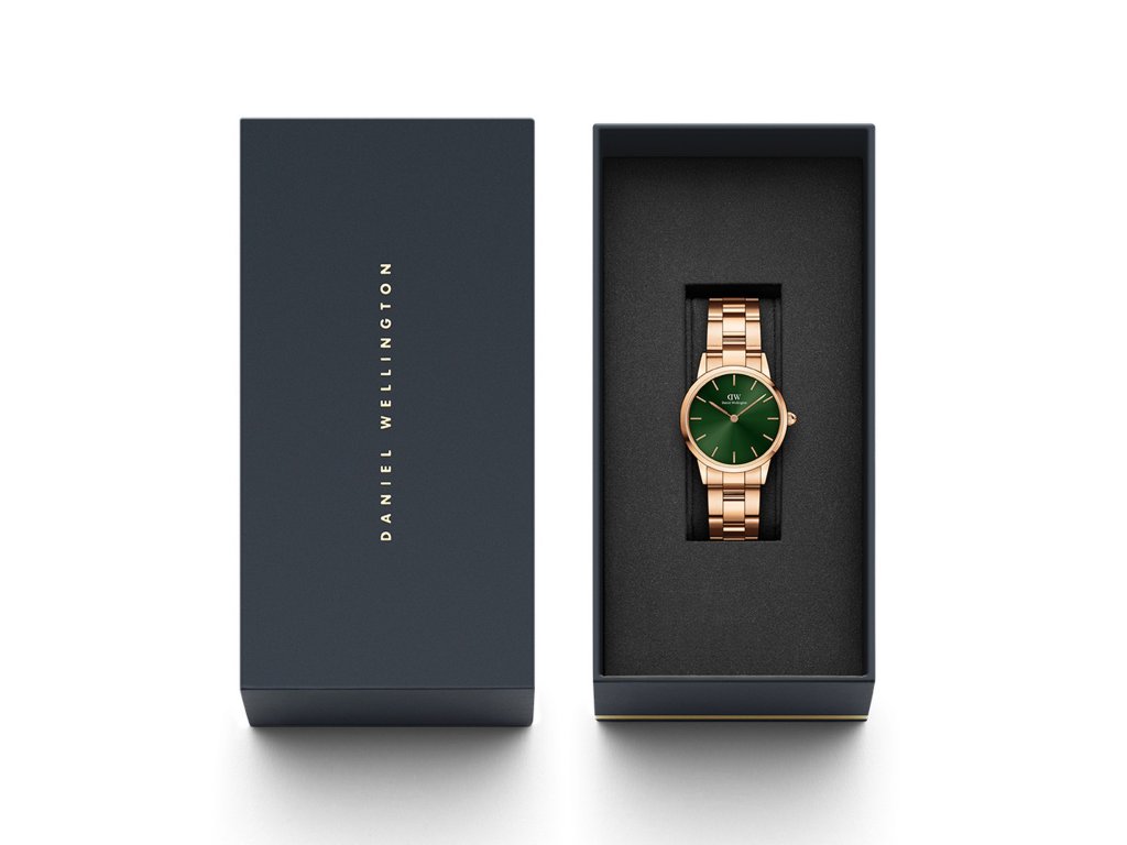 Kovový remienok z lešteného ružového zlata s tmavozeleným ciferníkom. Ide o hodinky Iconic Link Emerald, ktoré sú vybavené povrchovou úpravou v tvare slnečného lúča a sú vyrobené z nehrdzavejúcej ocele. Čistý dizajn hodiniek dopĺňa 28 mm puzdro.