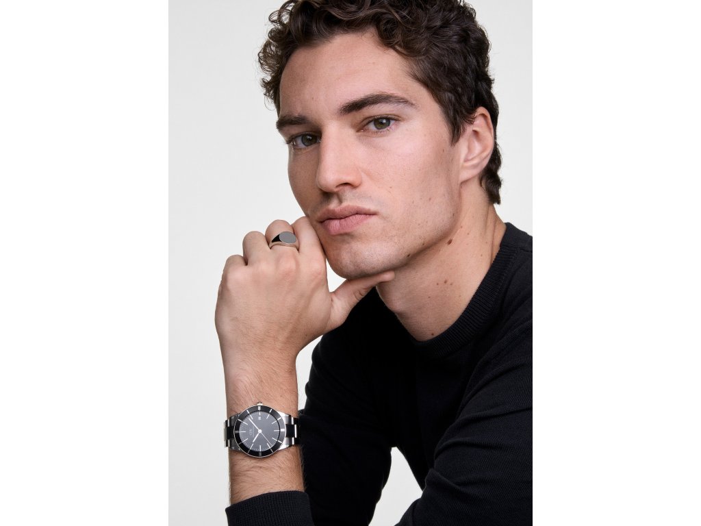 Hodinky sú vybavené širším lunetovým prsteňom, ktorý zdôrazňuje ich sofistikovaný vzhľad.Čierna luneta s indexovými značkami plynule nadväzuje na ciferník v rovnakom odtieni, čím vytvára harmonický vizuálny efekt. Je vyrobený z pevného hliníka, eloxovaný a má hladký smaltovaný povrch.