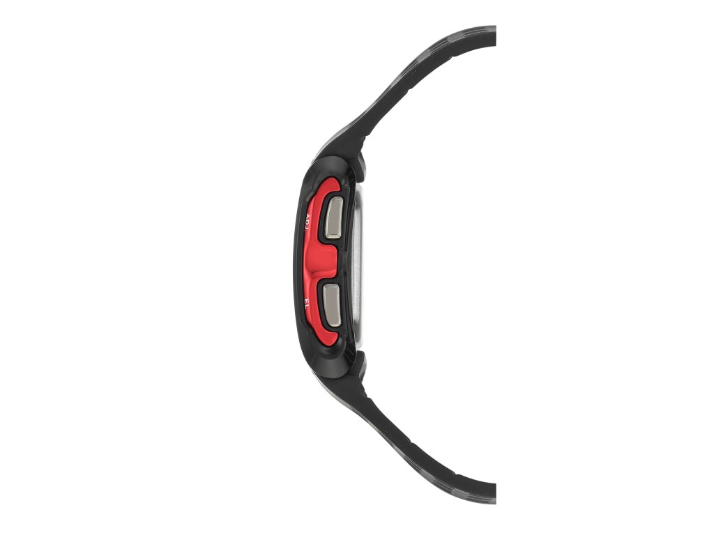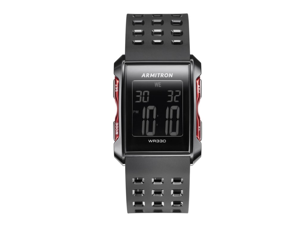 Obdĺžnikové čierne hodinky Armitron s digitálnym displejom a mnohými funkciami.
