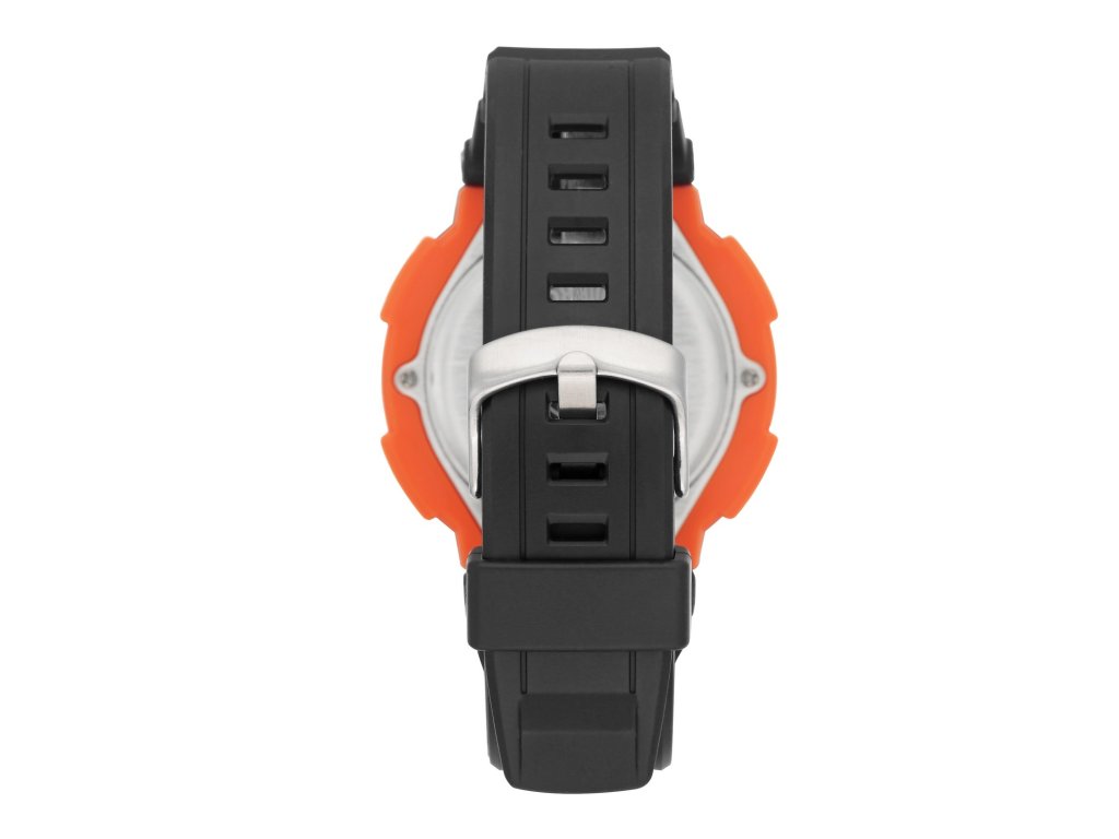 Športové pánske hodinky Armitron s multifunkčným displejom a oranžovými kontrastmi.