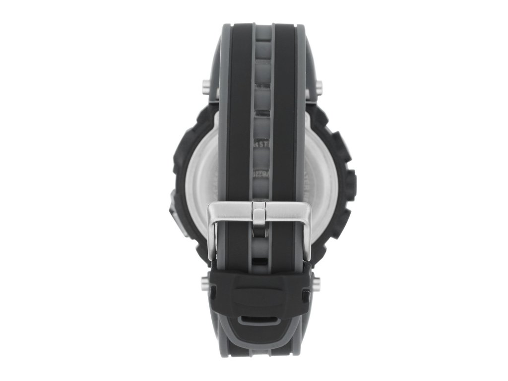 Športové digitálne hodinky s výraznou kombináciou čiernej a striebornej farby s červenými doplnkami.